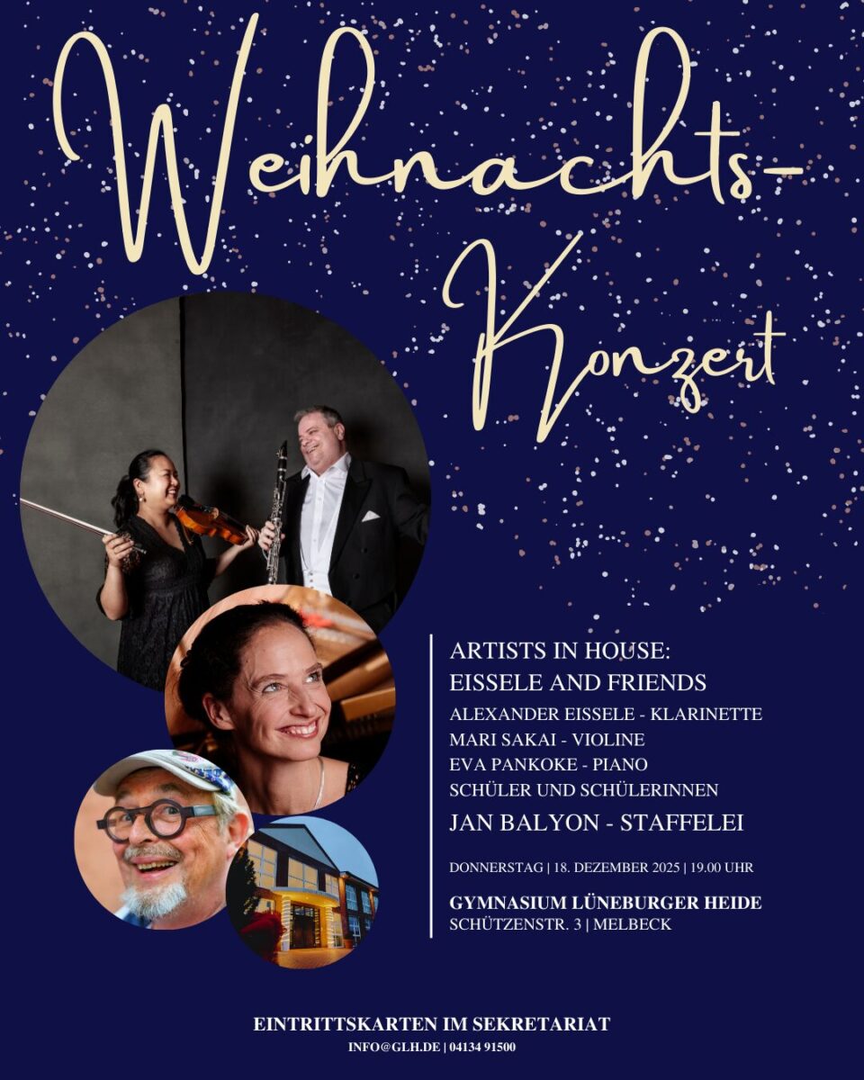 Am 18.12. findet in diesem Jahr ein besonderes Weihnachtskonzert statt: Alexander Eissele and friends musizieren alleine, aber auch gemeinsam mit unseren Schülerinnen und Schülern! Der Lüneburger Künstler Jan Balyon wird das Konzert malerisch einfangen. Tickets gibt es – solange der Vorrat reicht – im Sekretariat zu kaufen.