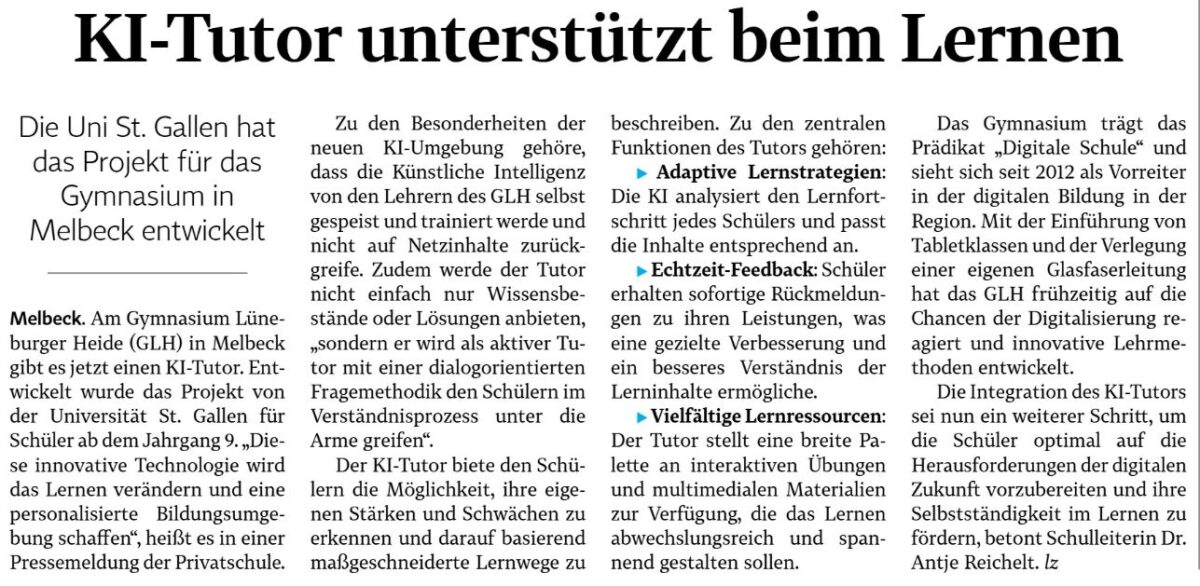 Am GLH in Melbeck gibt es jetzt einen KI-Tutor. Entwickelt wurde das Projekt von der Universität St. Gallen für Schüler ab dem Jahrgang 9. „Diese innovative Technologie wird das Lernen verändern und eine personalisierte Bildungsumgebung schaffen“.