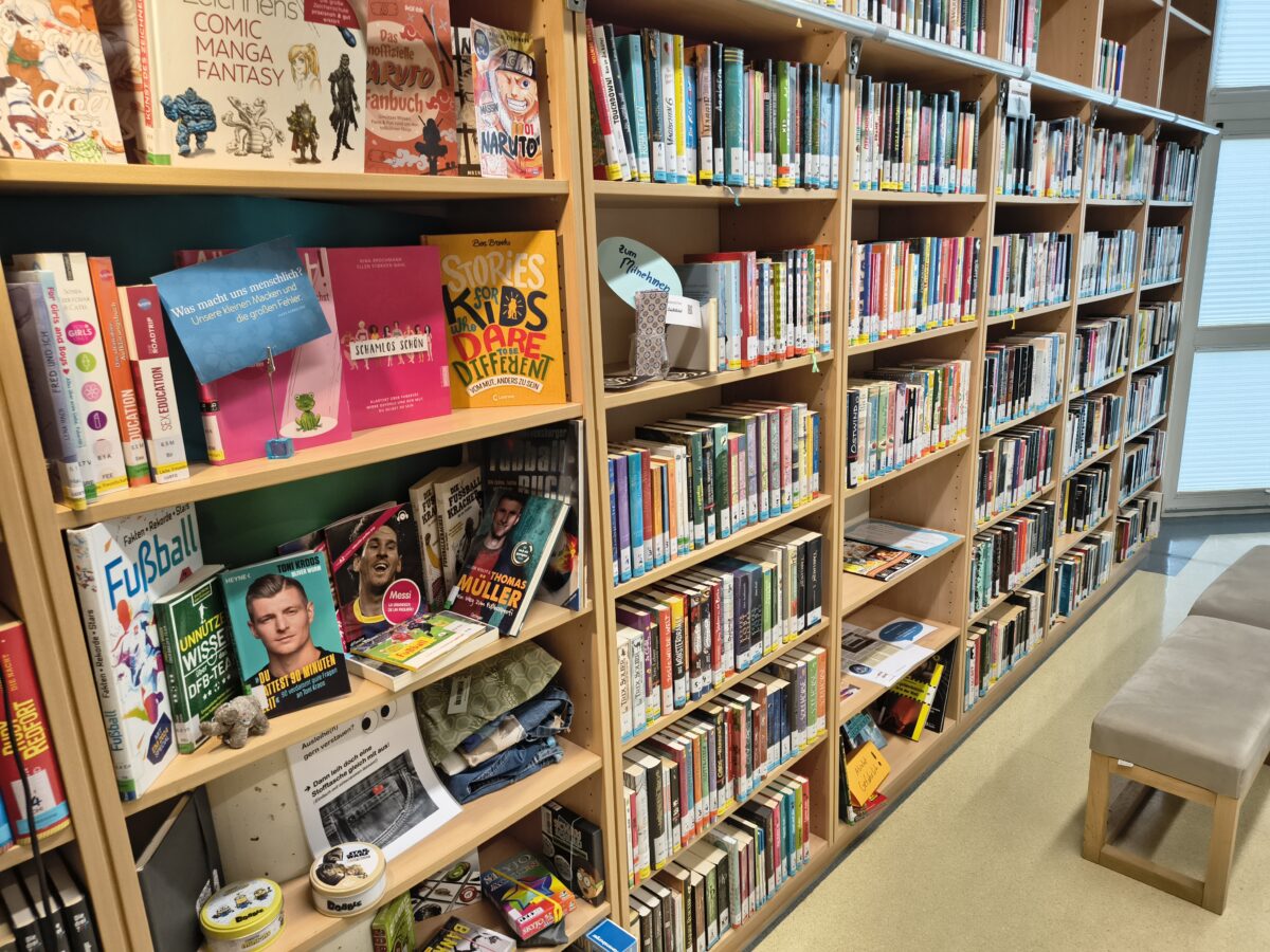 Lesebegeisterte Schülerinnen und Schüler finden in unserer Schulbibliothek Literatur zu fast allen Themen und viele fremdsprachliche Bücher, Hörbücher und Lernhilfen. Nahezu monatlich kommen aktuelle Bücher und Zeitschriften hinzu. Wer möchte, übernimmt in einigen Pausen den Bibliothekdienst und kann Regale und Auslagen dekorieren, für Ordnung sorgen, Mitschüler beraten und als erste/r unsere Neuanschaffungen sichten.